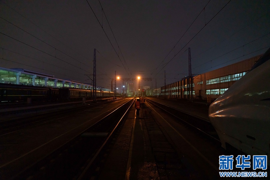 检查完动车组,苏盛行走在列车停车场内。新华网发 赵磊 摄