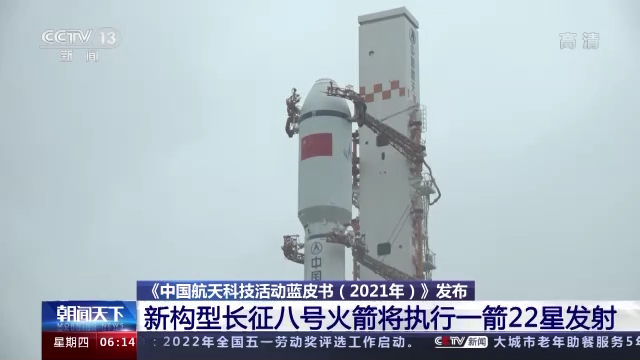 记者从《中国航天科技活动蓝皮书》(2021年)发布会上了解到,我国新一代中型运载火箭——长征八号,目前正在海南文昌发射场进行发射前的测试工作。此次发射的长征八号采用了全新的构型,将一次发射22颗卫星。