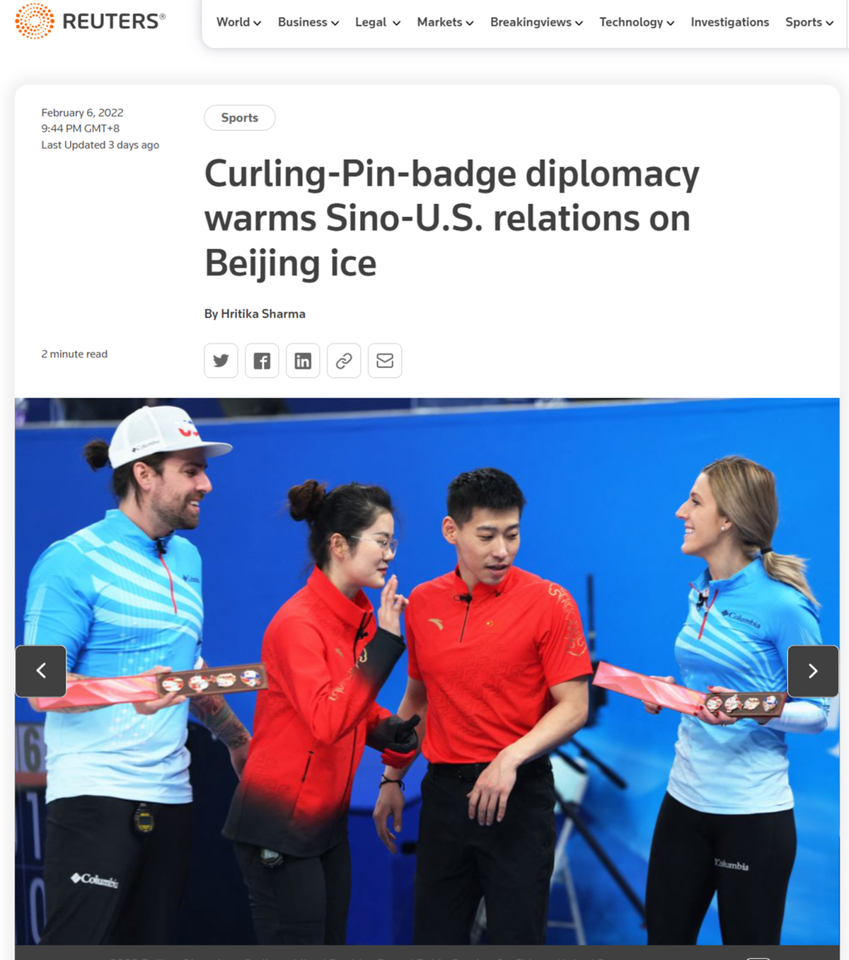 5日,中国冰壶混双组合在与美国队比赛结束后,拿出一组“冰墩墩”奥运纪念徽章,赠送给美国队员。两国运动员赛后亲切合影,成为“暖心”一幕。外媒评论称,无论冰上竞赛多么激烈,中美运动员之间相互尊重的友谊却如此温暖,能够推动中美关系升温。