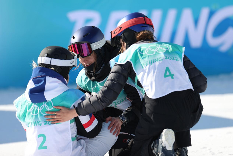 2月8日,中国选手谷爱凌(右)和瑞士选手玛蒂尔德·格雷莫德(中)在比赛后安慰法国选手泰丝·勒德。当日,北京2022年冬奥会自由式滑雪女子大跳台决赛在北京首钢滑雪大跳台举行。新华社记者 丁旭摄