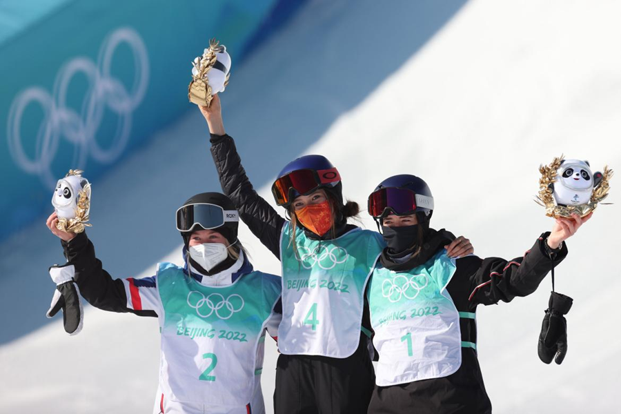 2月8日,夺得冠军的中国选手谷爱凌(中)、获得亚军的法国选手泰丝·勒德(左)和获得季军的瑞士选手玛蒂尔德·格雷莫德在颁发纪念品仪式上。新华社记者 丁旭摄