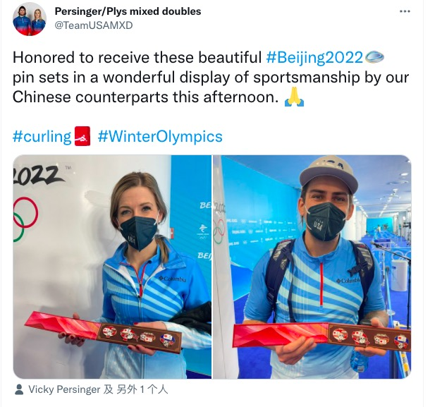 两名美国队选手对“冰墩墩”徽章爱不释手