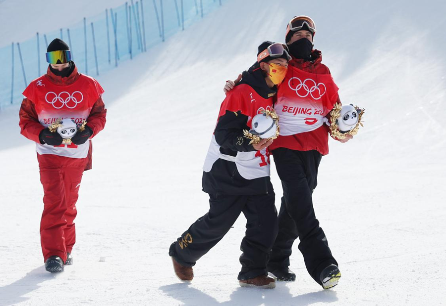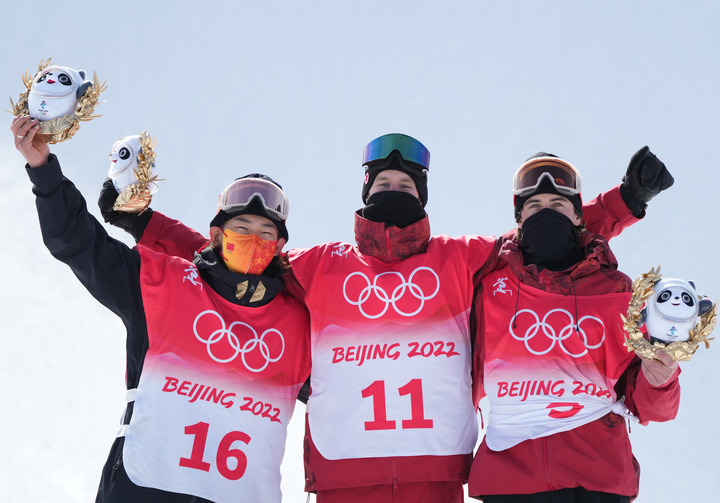 2月7日,获得冠军的加拿大选手马克斯·帕罗特(中),获得亚军的中国选手苏翊鸣(左)和获得季军的加拿大选手马克·麦克莫里斯在颁发纪念品仪式上。新华社记者 杨世尧摄