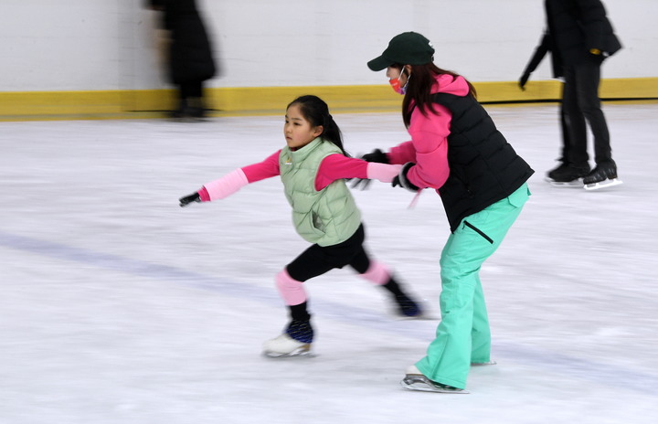2月9日,一名儿童在朝阳大悦城的冰雪运动馆体验和学习滑冰。新华社记者李欣摄