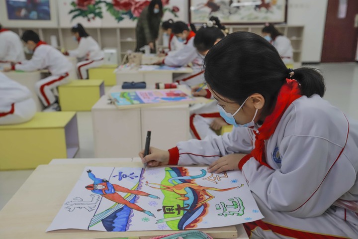 2021年11月17日,河北省唐山市路北区世嘉实验小学的学生在进行迎冬奥主题绘画作品创作。新华社记者刘满仓摄