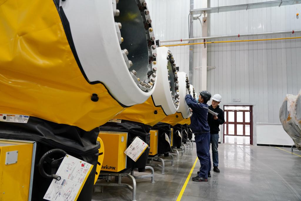 2021年5月20日,天冰冰雪设备张家口有限公司工人在厂房内保养检修造雪设备。新华社记者牟宇摄