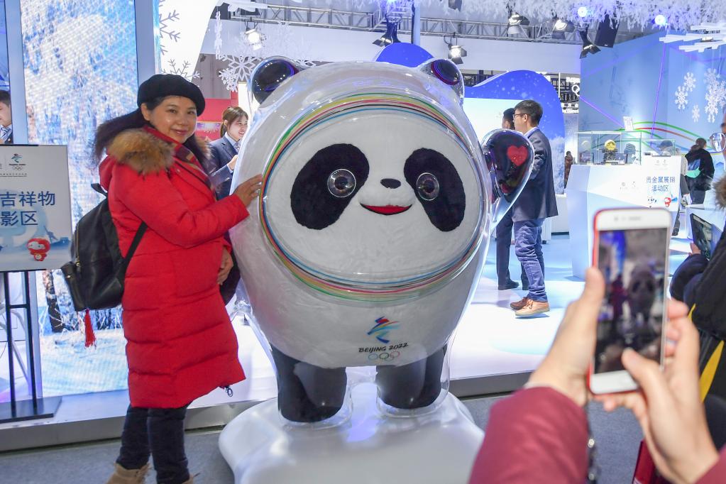 2019年12月13日,参观者在第四届吉林雪博会展会现场与北京2022年冬奥会吉祥物“冰墩墩”合影。新华社记者张楠摄