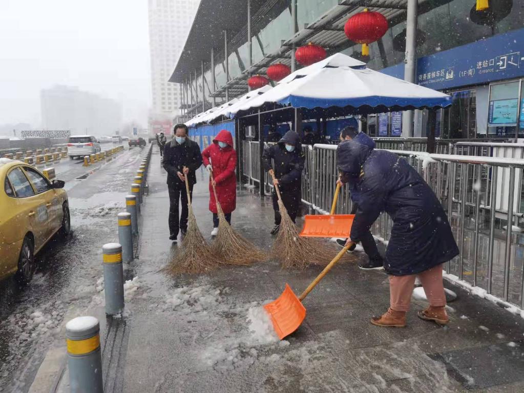南京火车站工作人员在进站口扫雪除冰。(铁路南京站供图)