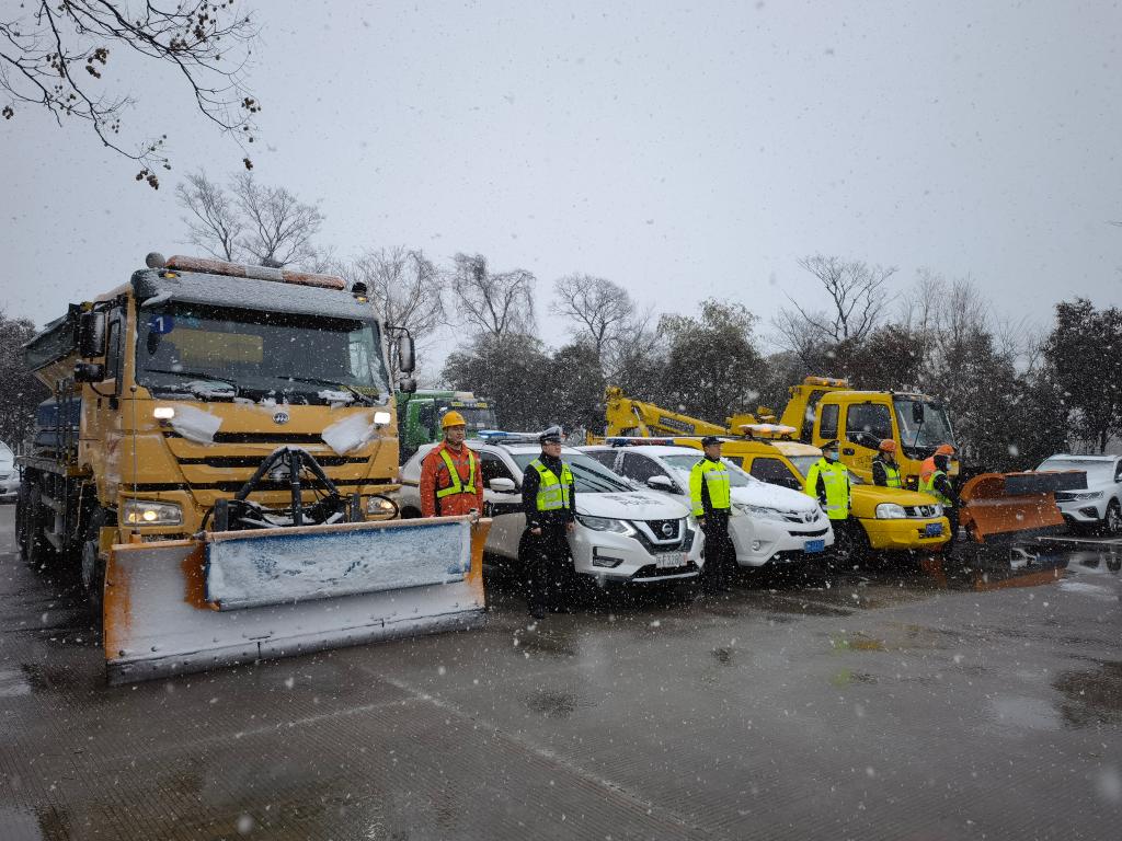 交通执法人员在雨雪天气中准备上路扫雪除冰。(江苏省交通综合执法局京沪支队第二大队供图)
