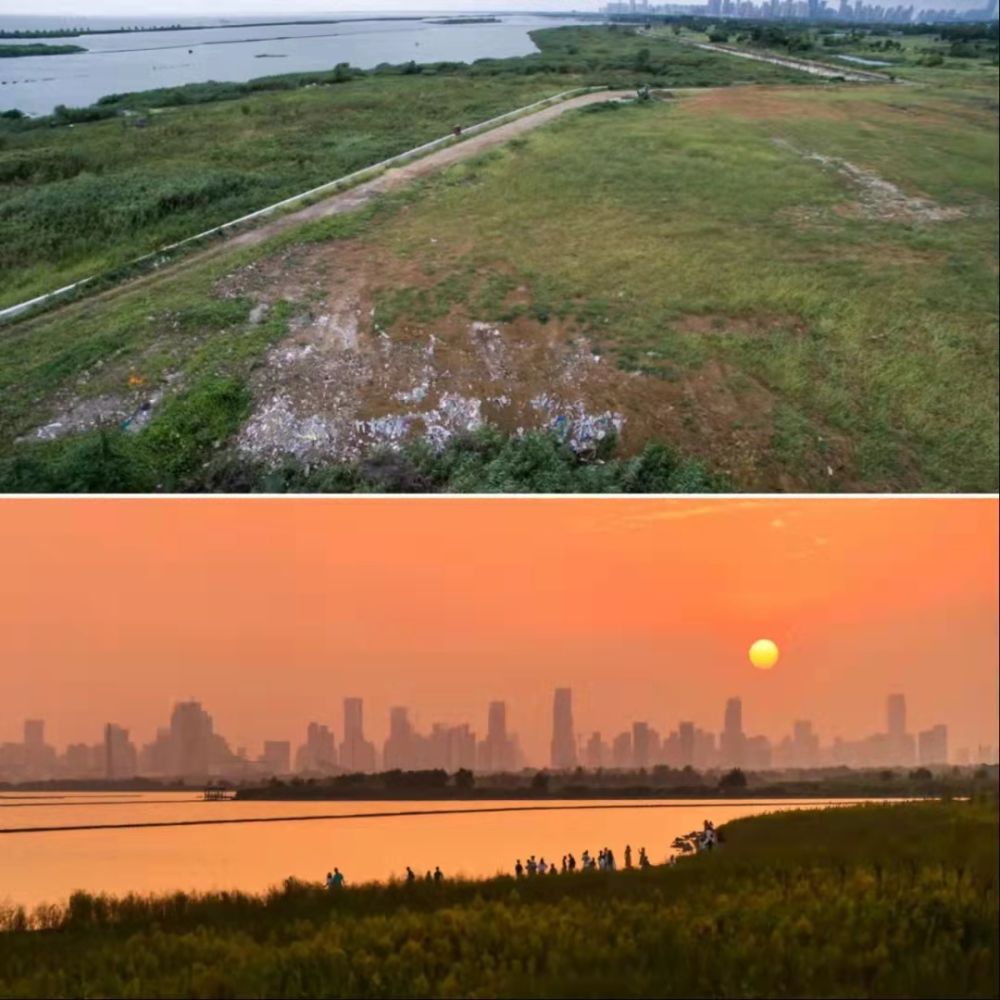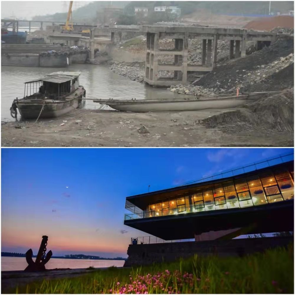 ▲上图:2013年11月14日拍摄的安徽铜陵滨江码头(詹俊/摄);下图:2019年5月5日拍摄的安徽铜陵滨江生态公园一隅(郜小兵/摄)