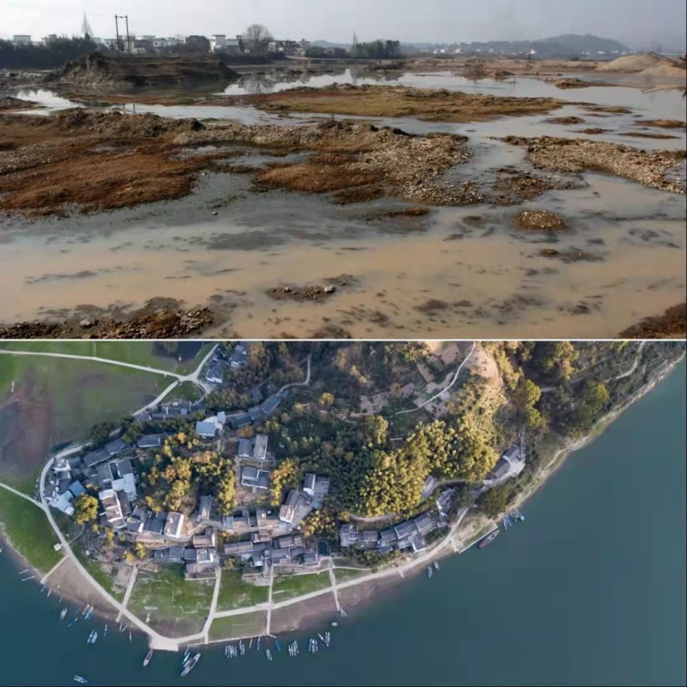 ▲上图:新安江源头之一的横江上,采砂后洗砂污水直接排入河流,造成水质变差(2008年1月5日摄)。下图:新安江山水画廊(2019年11月15日,新华社记者 韩晓雨/摄)