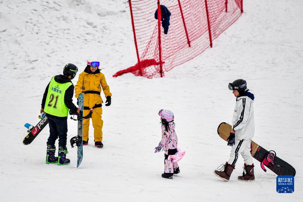 2021年2月15日,游客在位于四川省阿坝藏族羌族自治州的太子岭滑雪场体验冰雪运动。新华社记者张超群摄