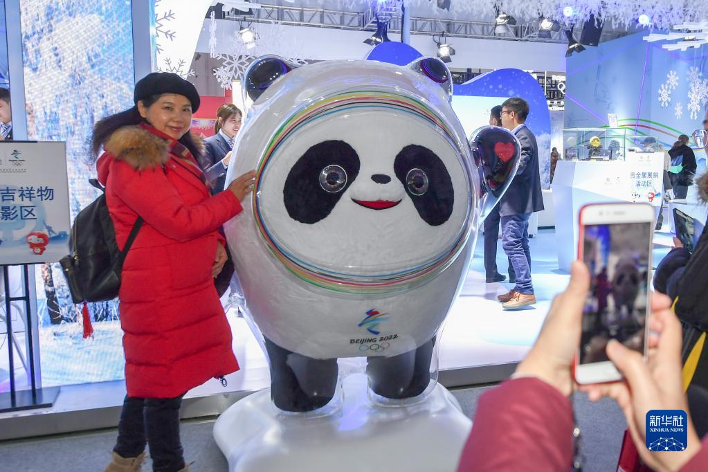 2019年12月13日,参观者在第四届吉林雪博会展会现场与北京2022年冬奥会吉祥物“冰墩墩”合影。新华社记者张楠摄
