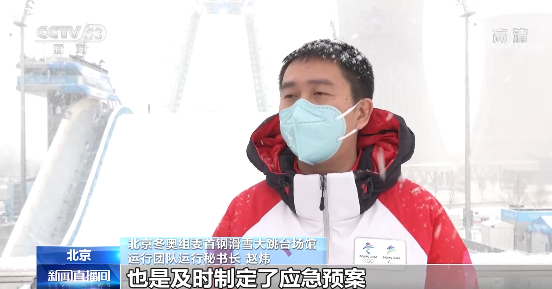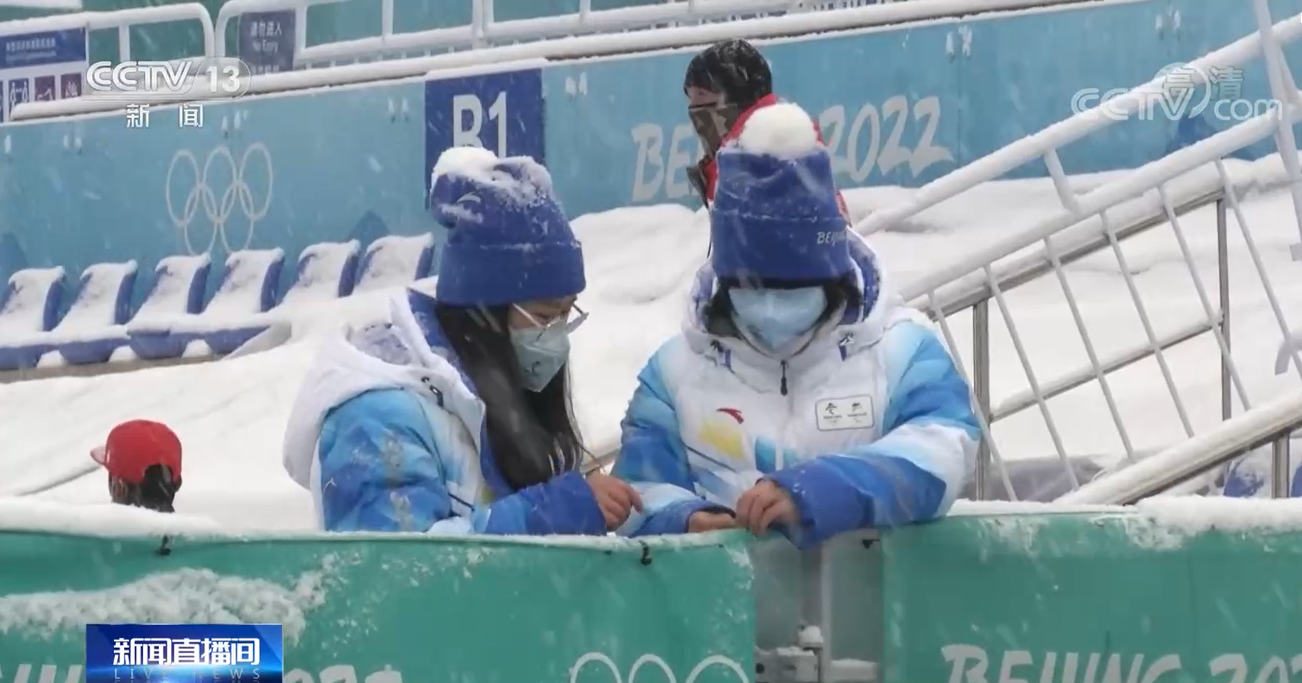 北京冬奥组委首钢滑雪大跳台场馆运行团队运行秘书长 赵炜:我们在5天以前就根据天气预报,包括我们自己气象团队分析的情况,也是及时制定了应急预案。您可以看到身后的赛道,我们二次(赛道)塑形团队从昨天(2月12日)晚上就已经24小时待命了。他们也会根据降雪的情况及时清理赛道表面的浮雪,以保障我们的训练还有后两天的比赛。
