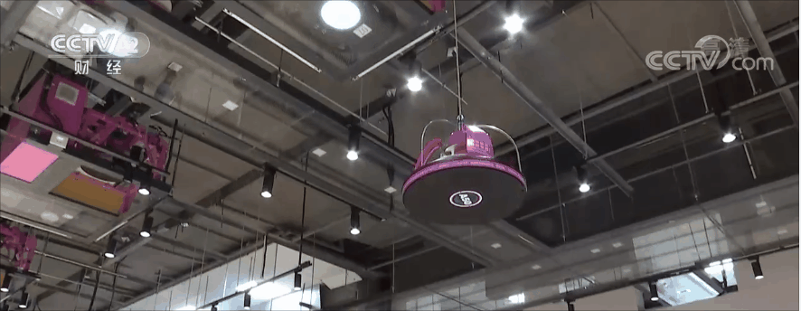在智能炒菜区,菜和调料按比例自动分配好,依次倒进炒锅里上下翻炒,炒好后被装进餐盘。通过自动升降设备 ,餐盘被送到上方的云轨里,再由云轨系统的智能小车进行精准定位,餐盘就会“从天而降”,送到相应的桌台上。