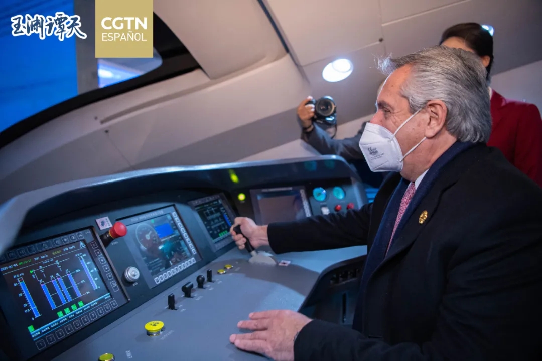 ▲阿根廷总统费尔南德斯在中国共产党历史展览馆体验中国高铁驾驶模型