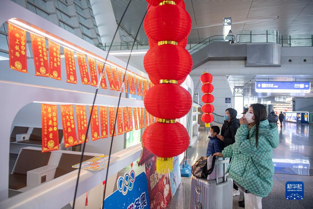 2月14日,旅客们在杭州东站候车室内猜灯谜。