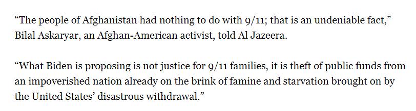 卡塔尔半岛电视台的报道指出,阿富汗人民并未参与“911”事件,这是不可否认的事实,拜登的计划不是为“911”遇难者家属伸张正义,而是从一个已经处于饥荒边缘的贫穷国家窃取公共资金。