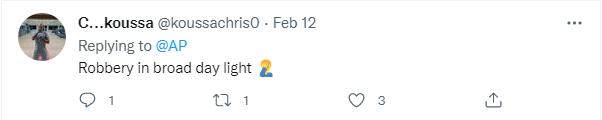 对于美国的这一决定,很多网友也直接斥之为抢劫。网友C...koussa在美联社的报道下留下了“光天化日之下抢劫”的评论。