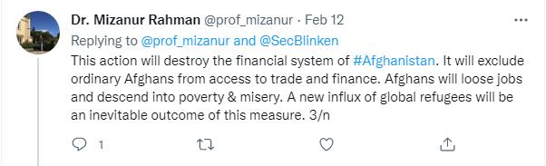 网友Dr. Mizanur Rahman认为,这一行动将摧毁阿富汗的金融体系。它将把普通阿富汗人排除在贸易和金融之外。阿富汗人将失去工作,陷入贫穷和痛苦。