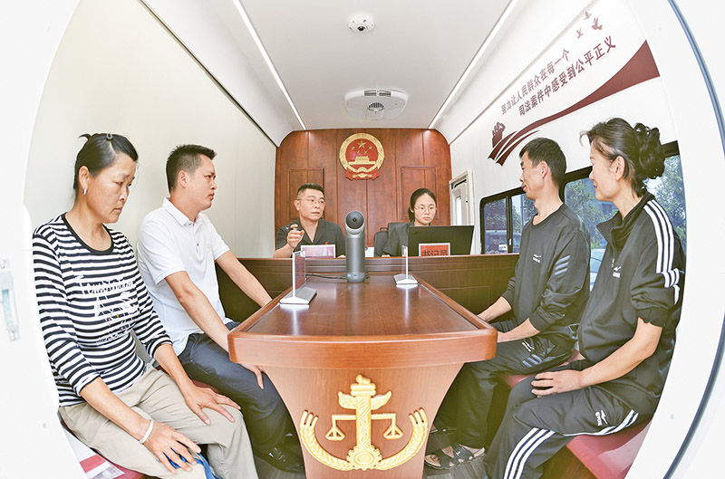 2021年9月1日,一款新式“车载便民法庭”开进重庆市云阳县凤鸣镇五同村,调查、辩论、举证、质证、打印、签收可于车内一次性完成,并与机关数字化法庭实现信息实时传输。图为“车载便民法庭”庭审现场。 中新社发 饶国君/摄