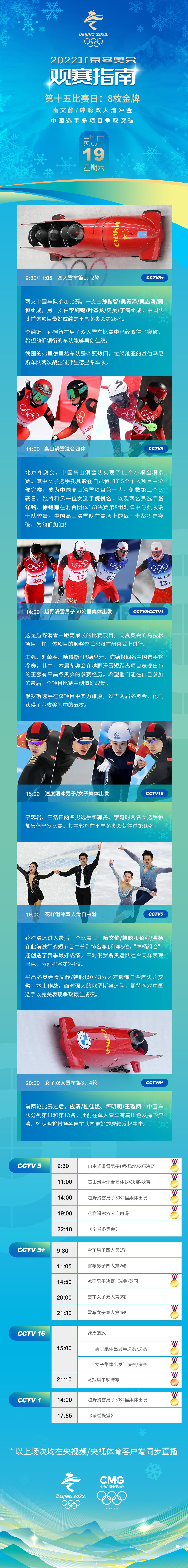 2月19日,2022年北京冬奥会第十五个比赛日,将产生8枚金牌。隋文静/韩聪双人滑冲金,中国选手多项目争取突破。