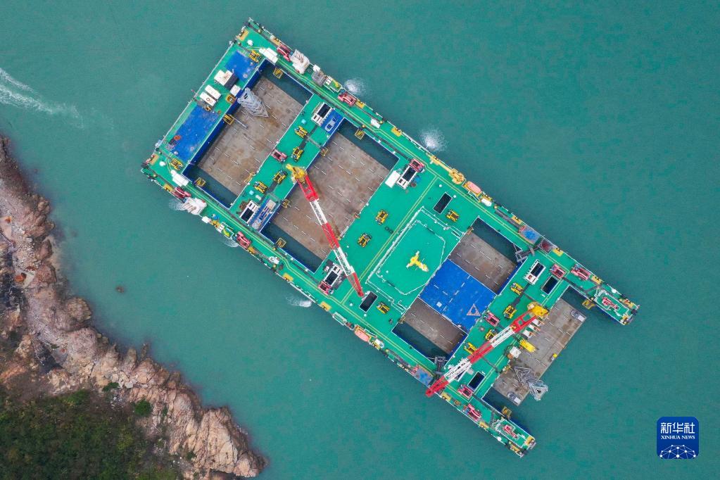 1月14日,中交一航局的“一航津安1”号沉管运输安装一体船搭载E16管节准备浮运前往珠江口伶仃洋安装现场(无人机照片)。新华社记者 刘大伟 摄