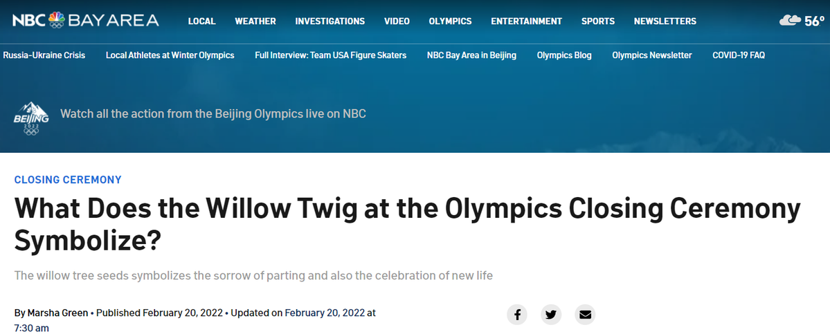 中国日报网2月21日电 “又一届冬奥会落下帷幕,每一次的闭幕仪式中,都会有欢乐、庆祝和反思的时刻。”当地时间20日,美国国家广播公司NBC报道了一篇题为《奥运会闭幕式上的柳枝象征着什么?》的文章,揭秘了闭幕式以“折柳”作为“缅怀”主题的深刻寓意及主创团队的独具匠心。