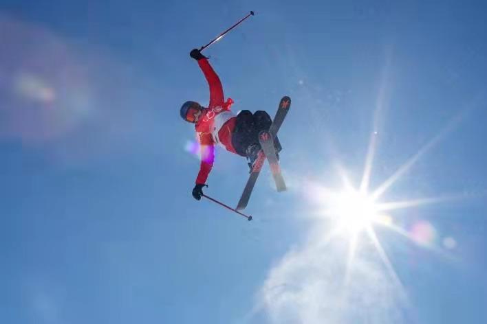 △北京冬奥会期间,蓝天白云下,正在参加比赛的运动员。