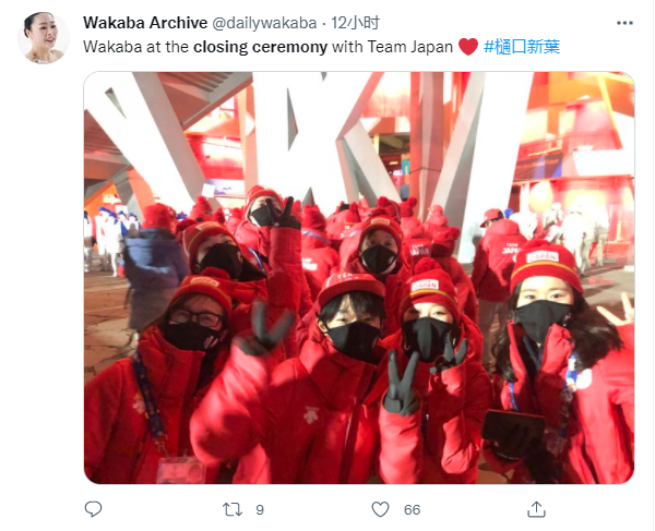 译文:Wakaba与日本队一起在闭幕式上。(图片来源:推特)