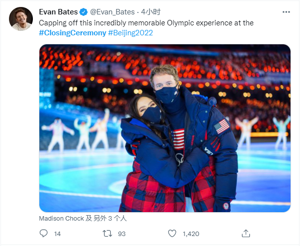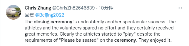 译文:闭幕式毫无疑问是另一次令人惊叹的成功。运动员和志愿者们不遗余力地付出,他们当然也收获了美好的回忆。显然,运动员们开始“玩”了起来,尽管仪式已经提醒“请落座”。他们已经沉浸其中了。(图片来源:推特)