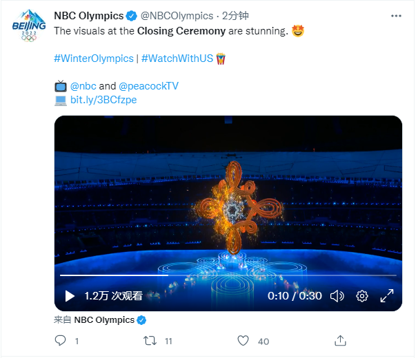 译文:喜欢(北京冬奥会闭幕式上的)增强现实技术。(图片来源:推特)