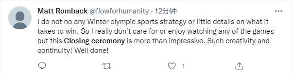 科技与文化完美交融,闭幕式再次让世界刷新了对中国的认知。有平时不怎么关注冬季运动的海外网友也被闭幕式的创造力和行云流水的表演所打动。