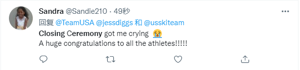 译文:闭幕式把我看哭了,给所有运动员们大大的祝贺!(图片来源:推特)