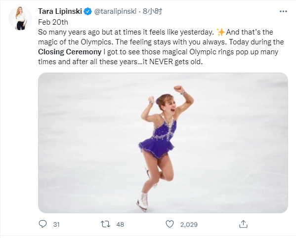 译文:多年过去了,但感觉起来就像昨天。这就是奥林匹克的魔力,你永远有这种感觉。今天(2月20日),当我在闭幕式上看到那些曾多次出现的五环这么多年以后再次奇妙地出现……(我知道)奥林匹克让人永远年轻。(图片来源:推特)