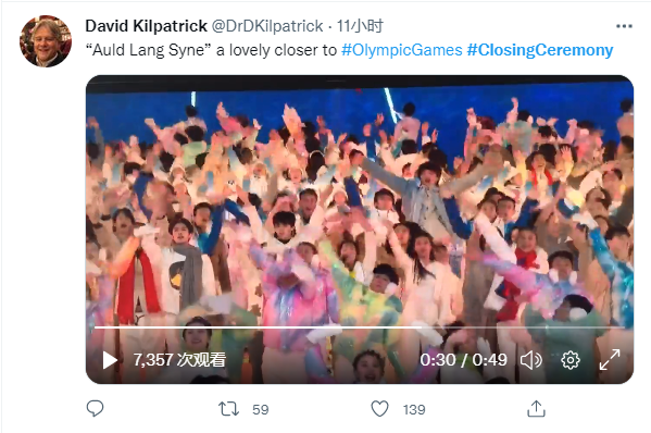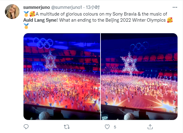 译文:缤纷绚丽的色彩在音乐《友谊地久天长》和电视画面中!北京2022冬奥会就这样结束了!(图片来源:推特)