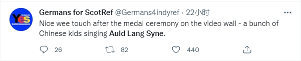 译文:一群中国儿童演唱《友谊地久天长》,我们在颁奖仪式后被感动了。(图片来源:推特)