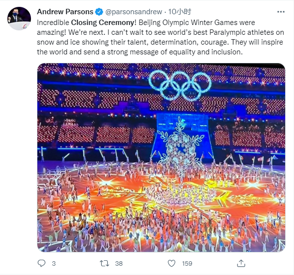 译文:难以置信的闭幕式!北京冬奥会太棒了!接下来就是我们了。我迫不及待地想看世界上最棒的残奥运动员在冰雪上展现他们的天赋、决心和勇气。他们会激励世界并传递强有力的关于平等和包容的信息。(图片来源:推特)