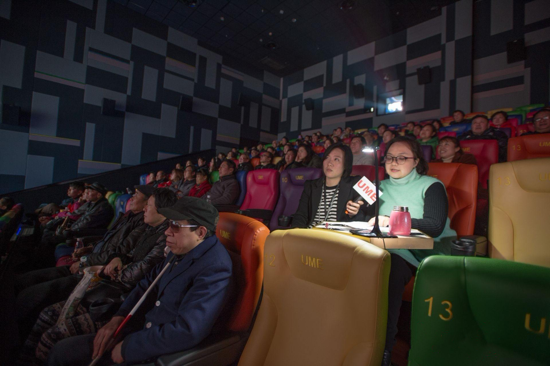 杜诚诚(第二排右一)在青山一家商业影院中,为盲人居民讲解正在放映的电影。