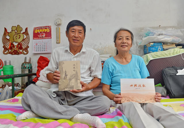杨玉芳(左)、高志宏(右)夫妇在家中展示他们所写的书。