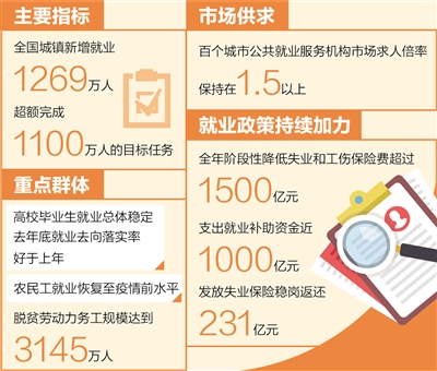 看主要指标,全国城镇新增就业1269万人,超额完成1100万人的目标任务;全年全国城镇调查失业率平均值为5.1%,比上年平均值下降0.5个百分点,就业目标任务圆满完成。