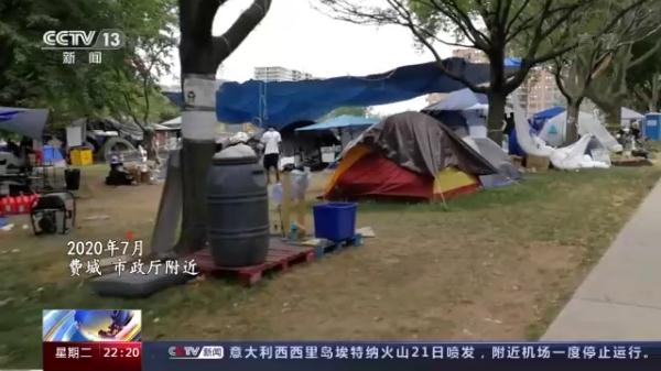 2020年7月,记者走访了费城,发现市政厅附近的一处公园里有一片扎满了帐篷的区域,居住着当地的无家可归者。这些帐篷之间距离很近,而且很多人的个人防护措施并不到位,为新冠疫情的传播埋下了隐患。