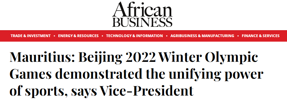 据非洲商业媒体African Business报道,为祝贺北京冬奥会胜利闭幕,当地时间2月21日,由毛里求斯新唐人街基金会(New China Foundation)举办的主题活动在当地举行。与会嘉宾一致认为,中国克服新冠疫情带来的诸多困难,高质量举办冬奥会,让全世界人民见证了中国和奥林匹克运动的魅力,也用实际行动展示了中国在促进团结与合作中所做出的努力,为世界各国树立了典范。