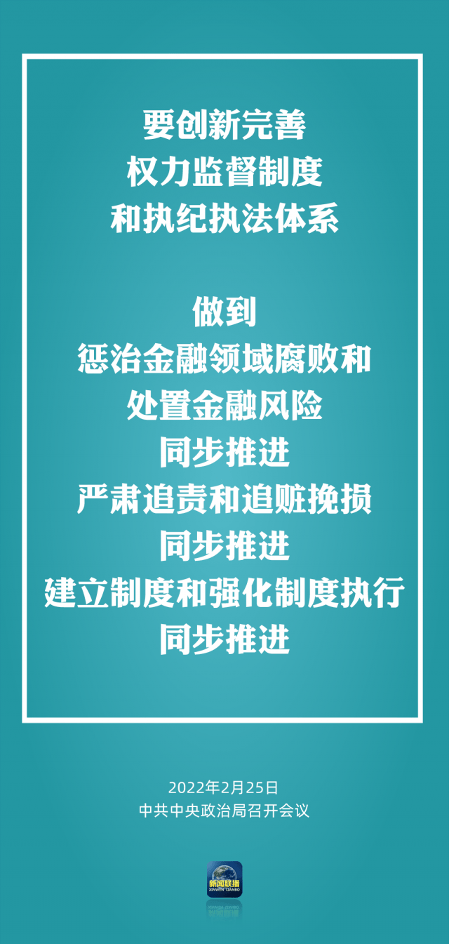 会议强调,要强化党中央对金融工作的集中统一领导,坚定不移走好中国特色金融发展之路。要强化金融风险防控,坚决维护金融稳定大局。要强化全面从严治党严的氛围,落实“两个责任”,加强对“一把手”和领导班子的监督,对违反中央八项规定精神、政商“旋转门”等典型共性问题开展专项整治,一体推进不敢腐、不能腐、不想腐。要创新完善权力监督制度和执纪执法体系,做到惩治金融领域腐败和处置金融风险同步推进、严肃追责和追赃挽损同步推进、建立制度和强化制度执行同步推进。要深入贯彻新时代党的组织路线,强化领导班子队伍建设。要深入推进金融领域改革,不断提高金融治理体系和治理能力现代化水平。
