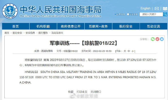 据中国海事局网站消息 清澜海事局发布航行警告,2月27日至3月1日,每天11时至15时,南海部分海域进行军事训练,禁止驶入。