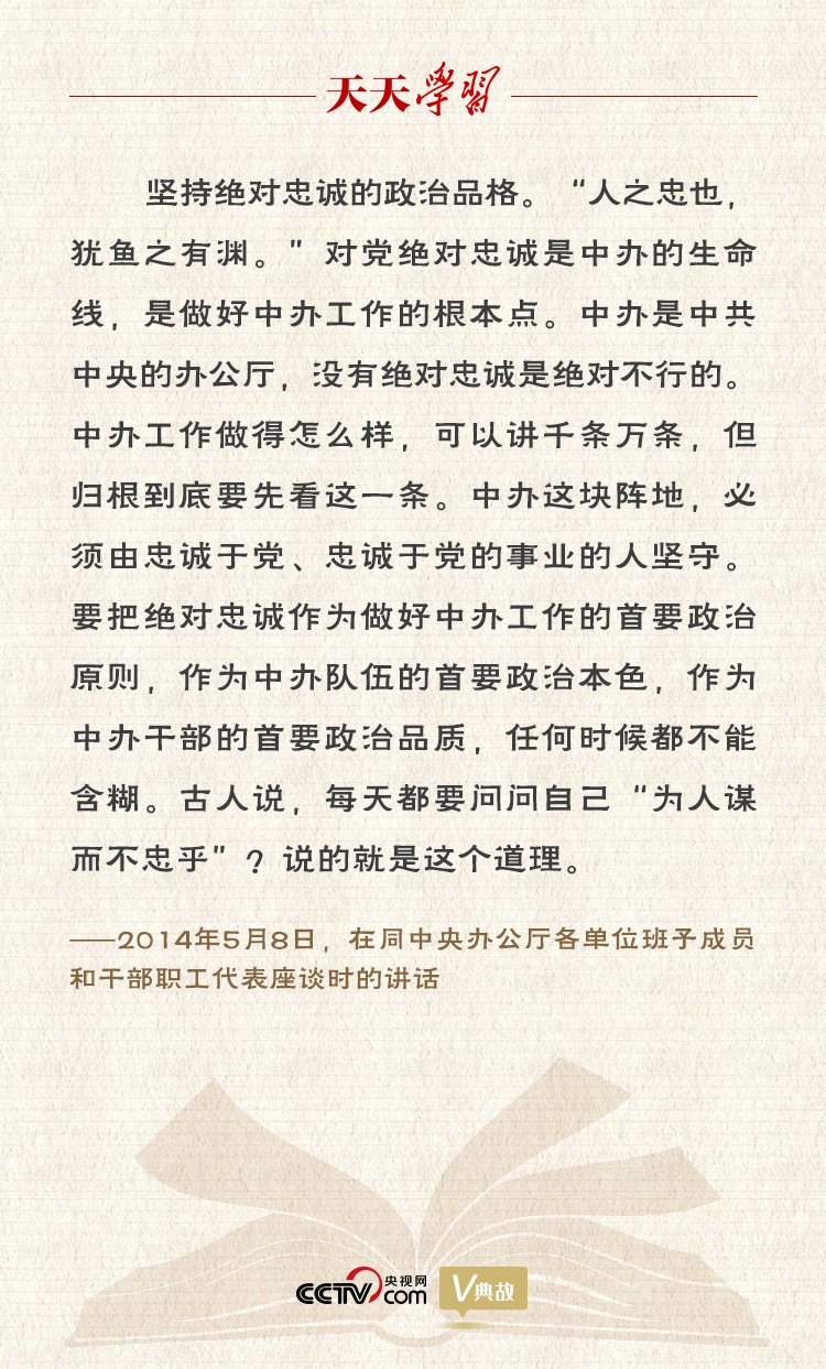 在这样的环境下,如果没有对党忠诚作政治上的“定海神针”,就很可能在各种考验面前败下阵来。习近平总书记强调,对党绝对忠诚要害在“绝对”两个字,就是唯一的、彻底的、无条件的、不掺任何杂质的、没有任何水分的忠诚。对于一名共产党员而言,对党忠诚从来都不是选答题、多选题,而是必答题、单选题;不是一阵子而是一辈子,不是临阵彷徨而是九死不悔;党叫干什么就坚决干,党不允许干什么就坚决不干,决不讲价钱、搞变通,决不说一套、做一套。哪怕有一点点杂质,都会导致忠诚褪色、政治变质,就会成为被敌人撕开的第一道“口子”。