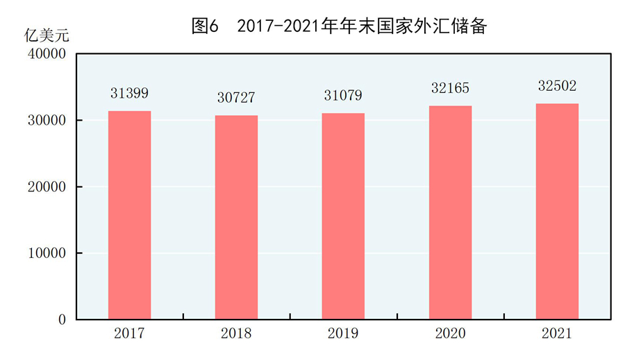 年末国家外汇储备32502亿美元,比上年末增加336亿美元。全年人民币平均汇率为1美元兑6.4515元人民币,比上年升值6.9%。