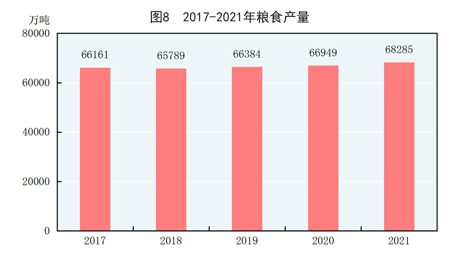 全年粮食产量68285万吨,比上年增加1336万吨,增产2.0%。其中,夏粮产量14596万吨,增产2.2%;早稻产量2802万吨,增产2.7%;秋粮产量50888万吨,增产1.9%。全年谷物产量63276万吨,比上年增产2.6%。其中,稻谷产量21284万吨,增产0.5%;小麦产量13695万吨,增产2.0%;玉米产量27255万吨,增产4.6%。