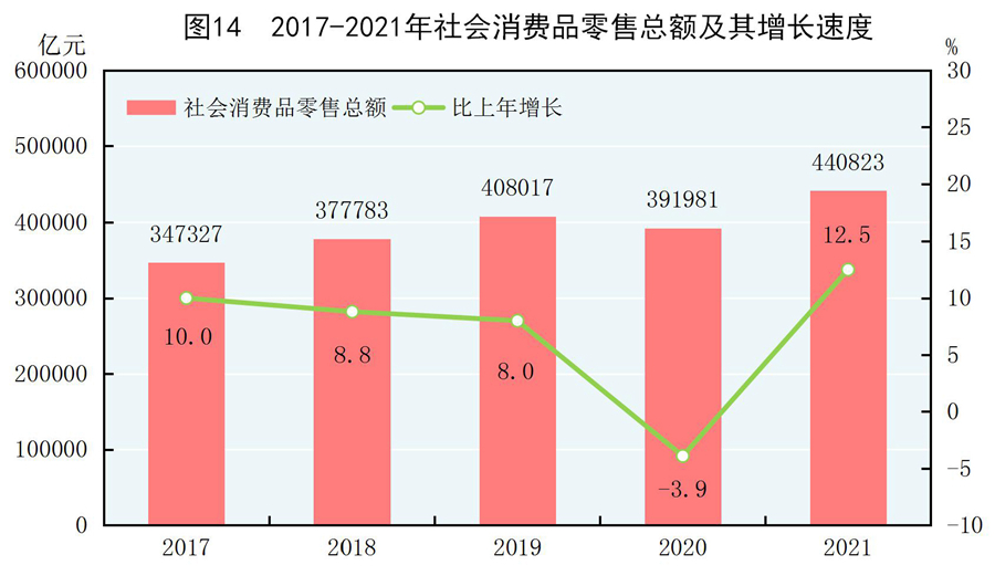 全年社会消费品零售总额440823亿元,比上年增长12.5%。按经营地统计,城镇消费品零售额381558亿元,增长12.5%;乡村消费品零售额59265亿元,增长12.1%。按消费类型统计,商品零售额393928亿元,增长11.8%;餐饮收入额46895亿元,增长18.6%。