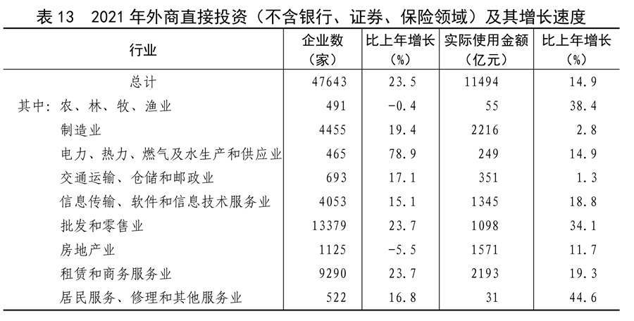 全年外商直接投资(不含银行、证券、保险领域)新设立企业47643家,比上年增长23.5%。实际使用外商直接投资金额11494亿元,增长14.9%,折1735亿美元,增长20.2%。其中“一带一路”沿线国家对华直接投资(含通过部分自由港对华投资)新设立企业5336家,增长24.3%;对华直接投资金额743亿元,增长29.4%,折112亿美元,增长36.0%。全年高技术产业实际使用外资3469亿元,增长17.1%,折522亿美元,增长22.1%。